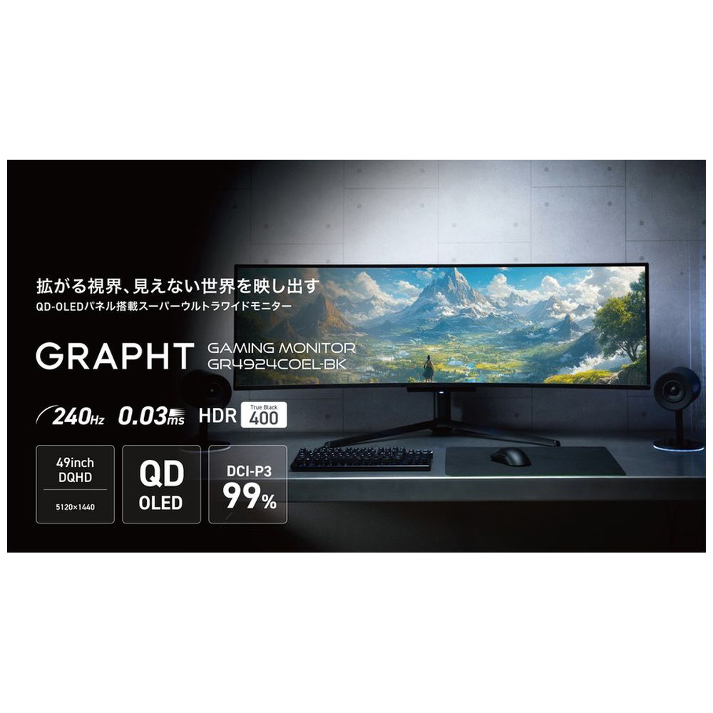 本製品『GR4924COEL-BK』は、49インチが“ゲーマーの新たな選択肢”となることを目指して、あらゆるゲームジャンルに対応するスペックと導入のしやすさを追求したモデルです。240Hzの高リフレッシュレートと0.03msの応答速度、さらに有機ELパネルと量子ドット技術を組み合わせたQD-OLEDによる精緻で豊かな色彩表現を実現。