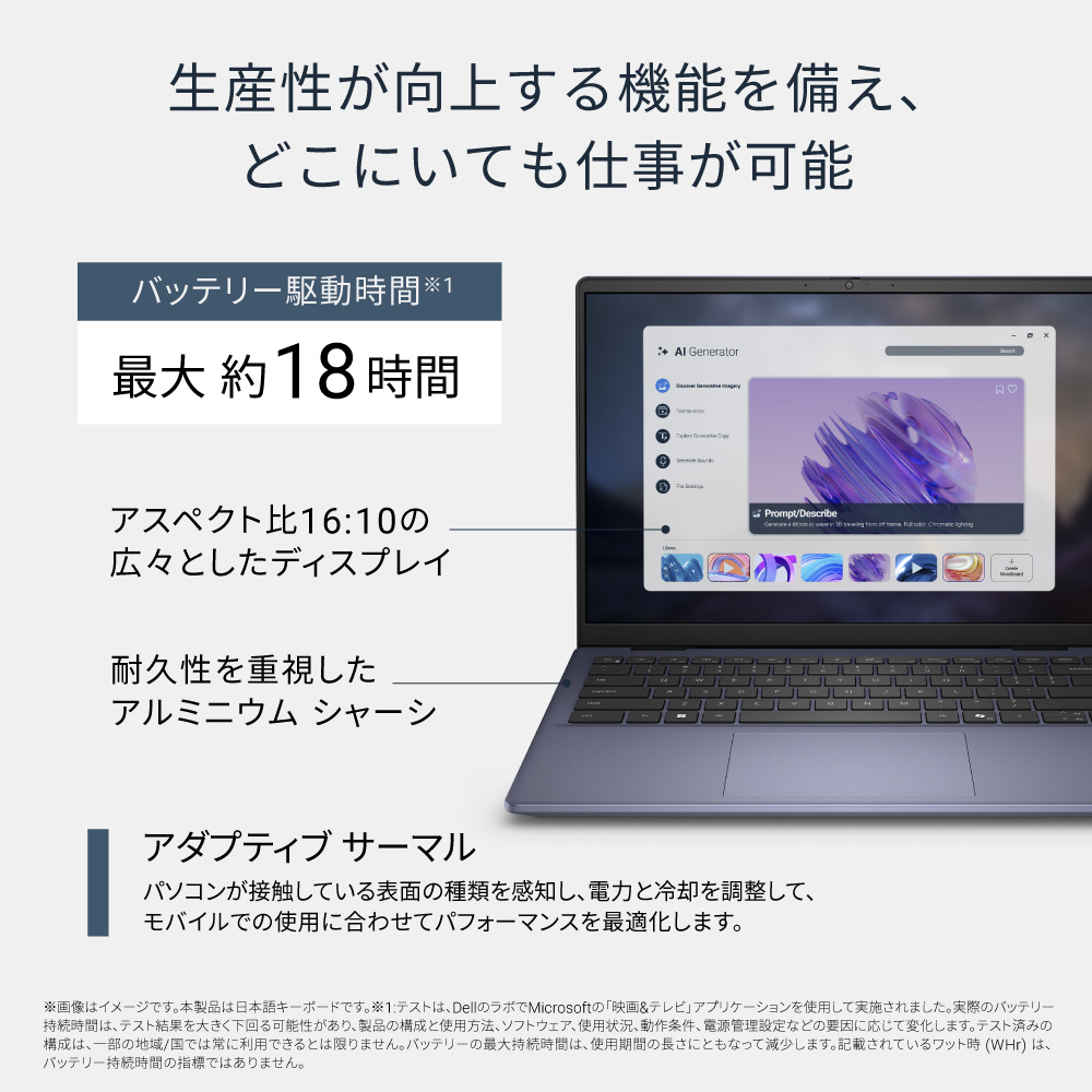 パソコンが接触している表面の種類を感知し、電力と冷却を調整して、モバイルでの使用に合わせてパフォーマンスを最適化します。