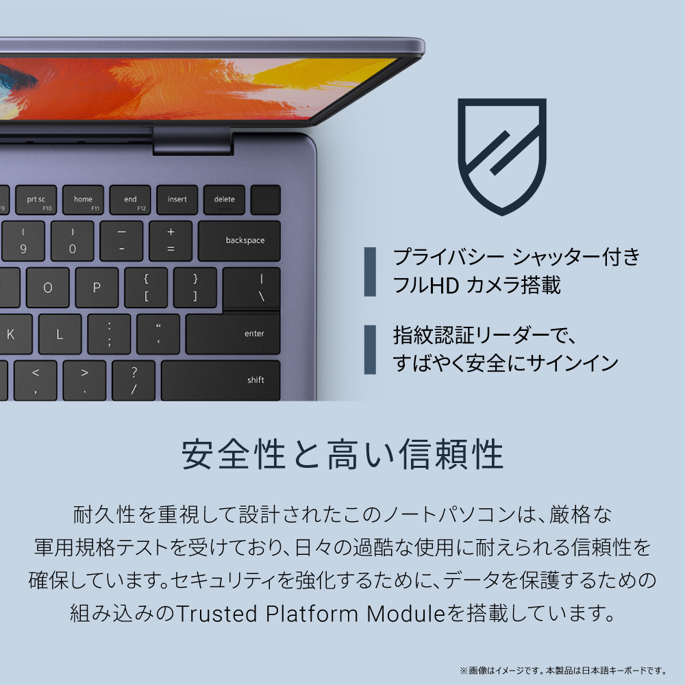 | 仕様3 | MIL-STD-810H準拠、dTPM搭載、指紋認証 |