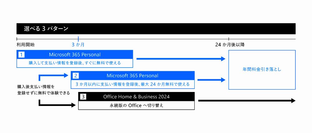Microsoft 365 Personalを3か月間お試しいただいた後、継続してさらに21か月間ご使用いただくことも、
