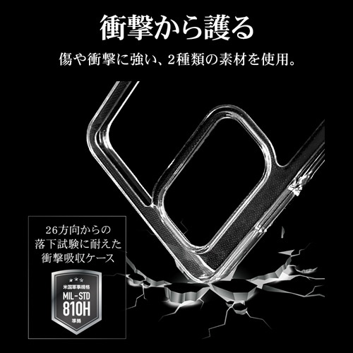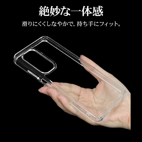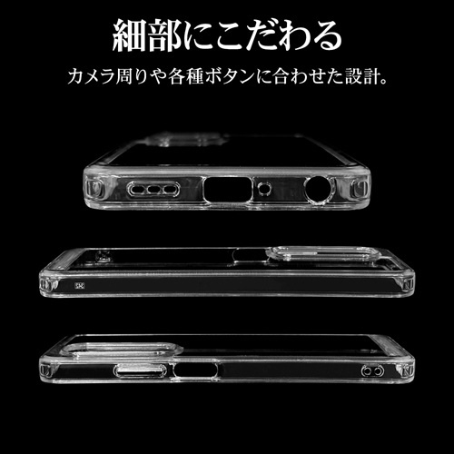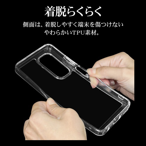 ●側面は弾力と柔軟性を兼ね備えたTPU素材で端末を衝撃から保護し、着脱も簡単です。※衝撃吸収については、一般的なポリカーボネート製ケースと比較した自社検証結果で、無破損、無故障を保証するものではありません。