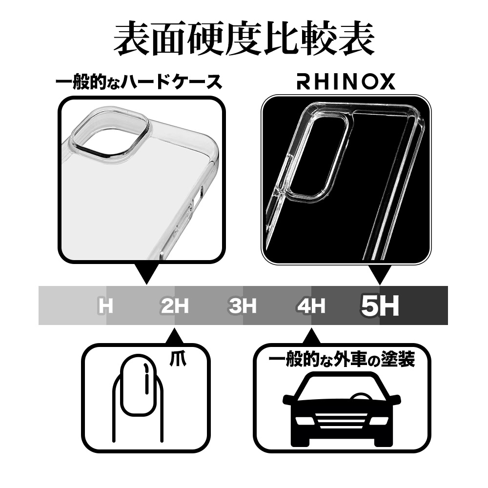 ●表面硬度5Hの傷に強いアクリル素材を背面に採用しています。