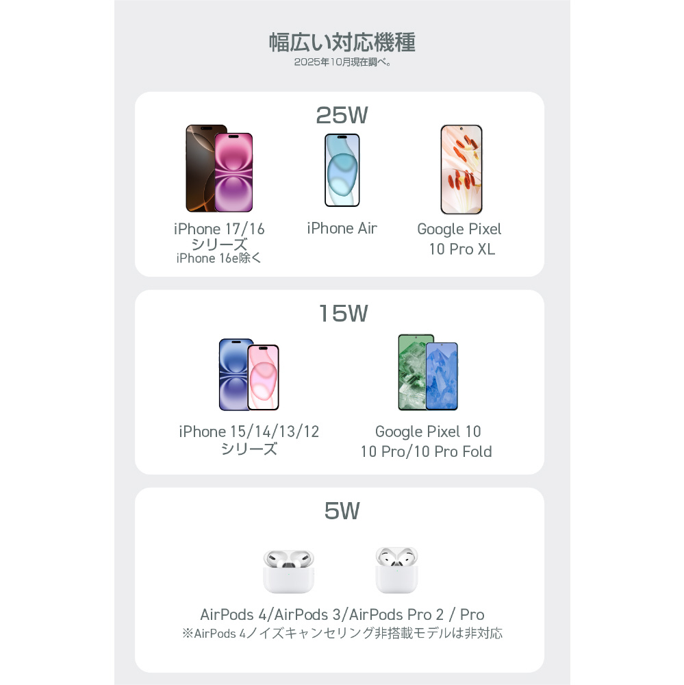 ※本製品にはUSB出力アダプター(AC充電器など)は付属しておりません。25Wでのワイヤレス充電には、USB Power Delivery 45W以上、15Wでのワイヤレス充電にはUSB Power Delivery 30W以上に対応したUSB出力アダプターを別途ご用意ください。