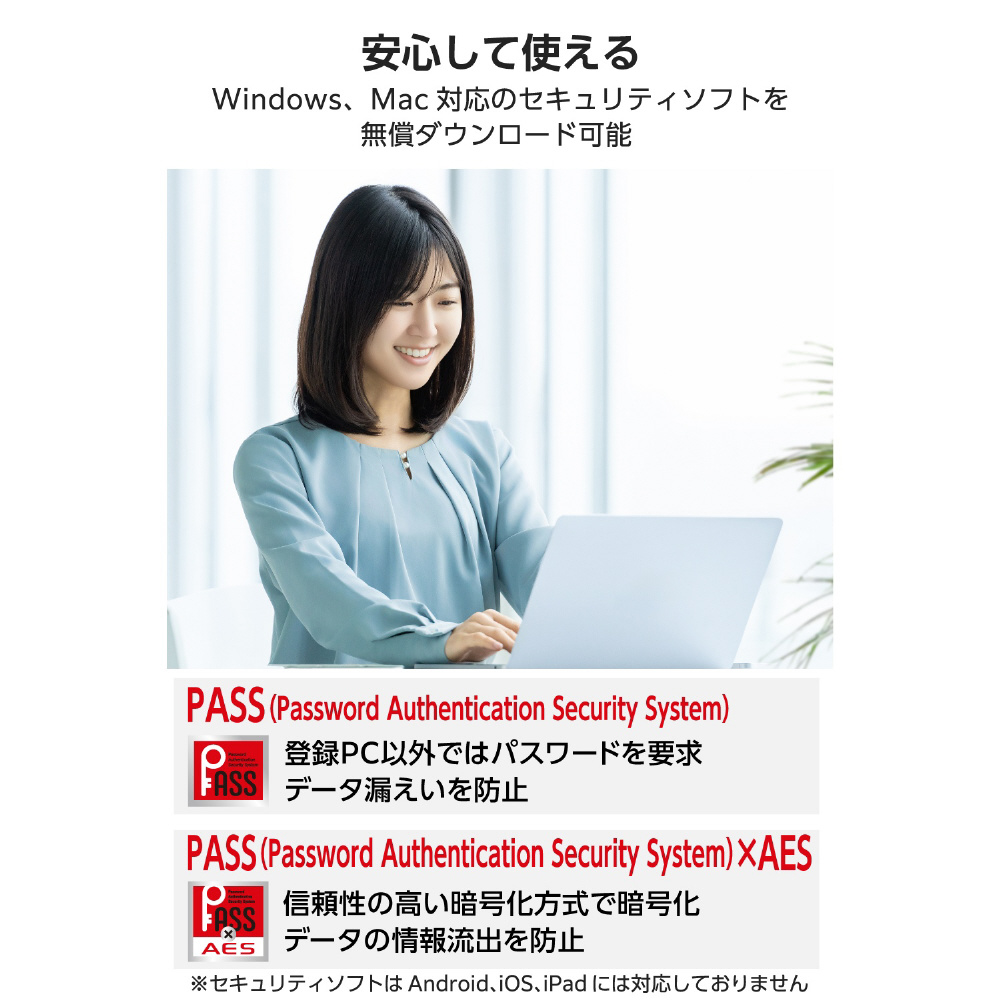 エレコム社Webサイトからダウンロードすることで、“パスワード自動認証機能”ソフト「PASS」あるいは、 “パスワード自動認証機能” + “データ暗号化機能”「PASS×AES」のみでの使用が可能です。