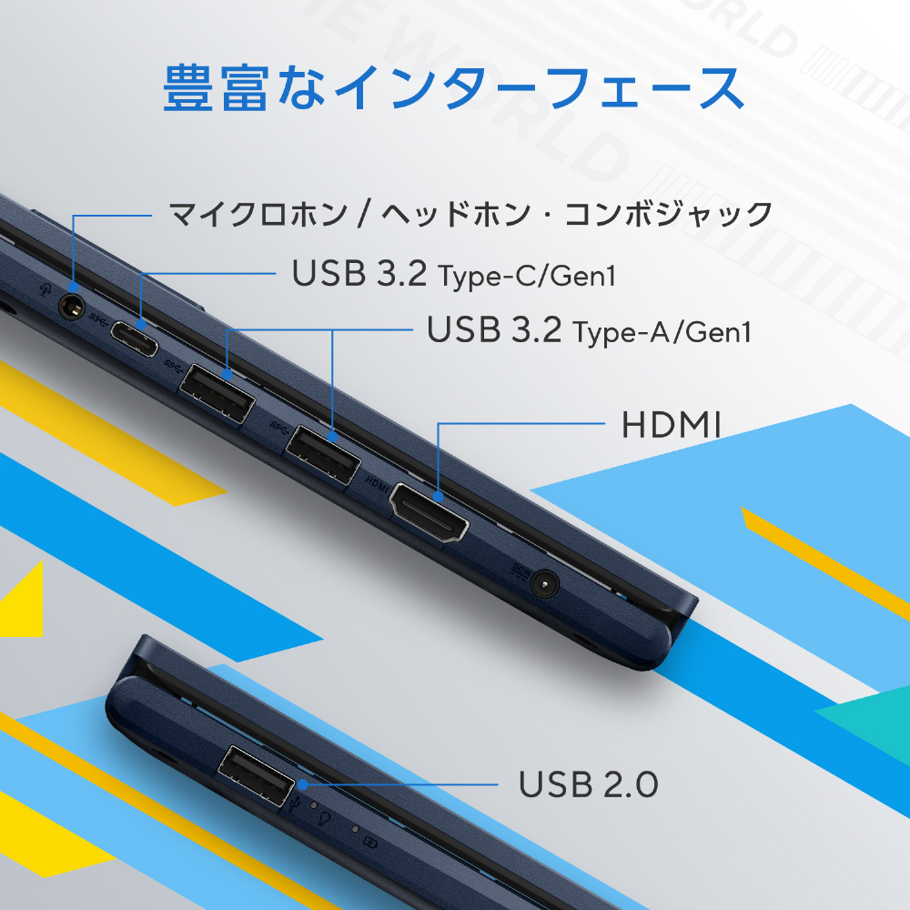 | インターフェイス | ディスプレイ出力:HDMI×1 USB3.2 (Type-C/Gen1) ※×1、USB3.2 (Type-A/Gen1) ×2、USB2.0×1 ※データ転送をサポートしています。すべてのデバイスの動作を保証するものではありません。映像出力と本機への給電はサポートしていません。 オーディオ:マイクロホン/ヘッドホン・コンボジャック×1 |