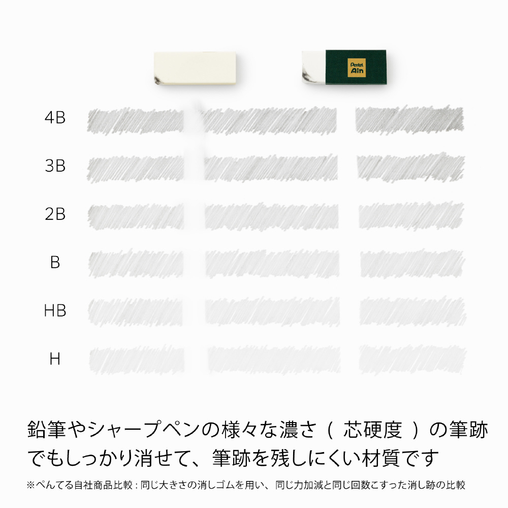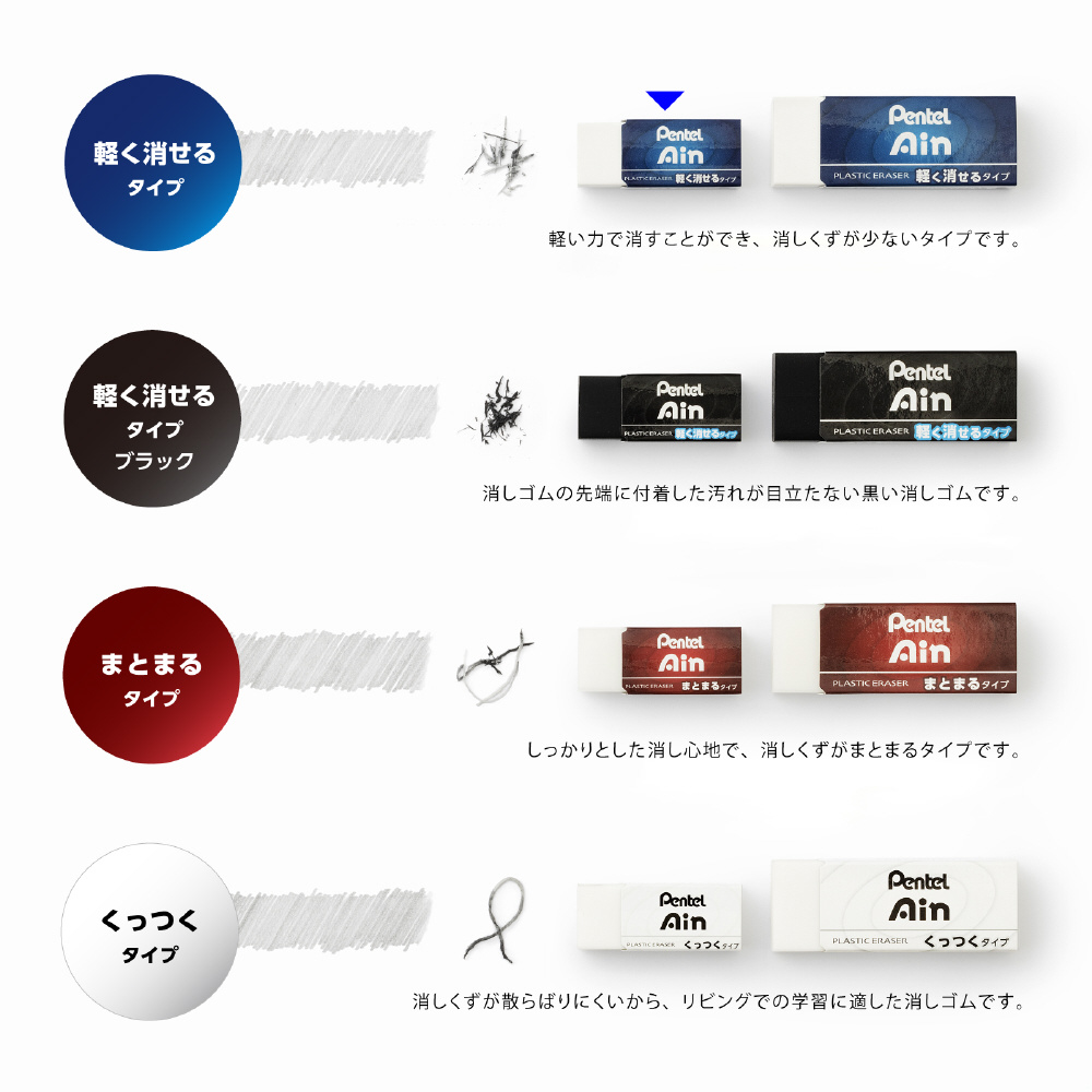 「Pentel Ain」は、「書く」と「消す」を安心の品質で支えるシャープペン替芯と消しゴムの総合ブランドです。ぺんてるでは、消しゴム・シャープペン・シャープペン替芯をいずれも自社製造し、製品同士の相性を追究しています。そのため、これらの製品は、一緒に使うことで最高のパフォーマンスを発揮します。