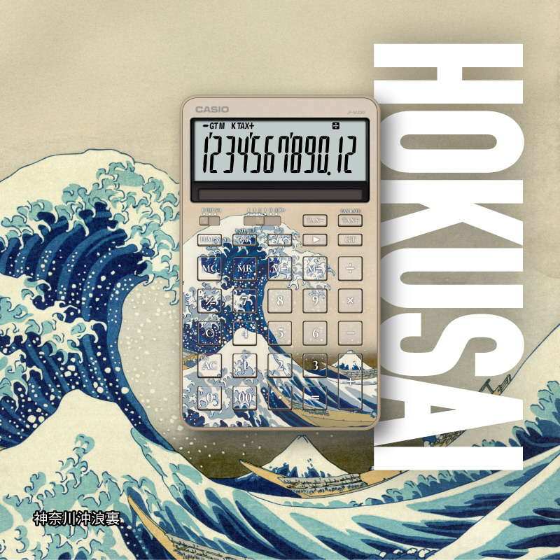 江戸時代の浮世絵師・葛飾北斎の代表作「神奈川沖浪裏(かながわおきなみうら)」をデザインモチーフにしたスタイリッシュ電卓。