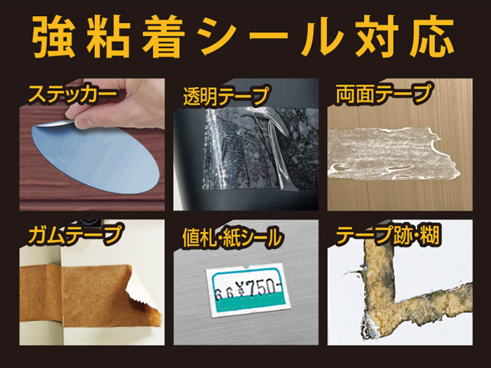 また、固着したテープ跡や、はがした後に残った糊もスッキリ落とします。