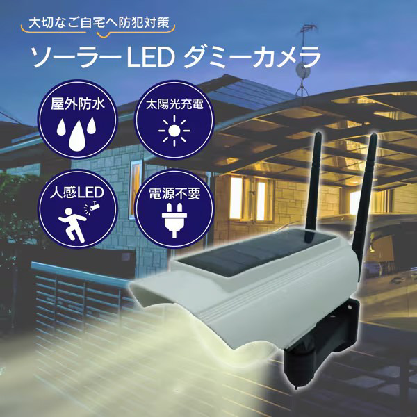 ソーラー充電と人感センサー付きLEDライトにより、ダミー防犯カメラ&夜間照明を兼用