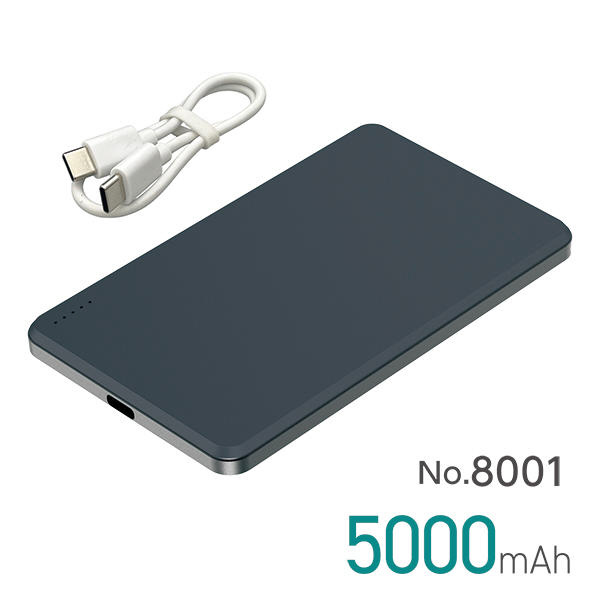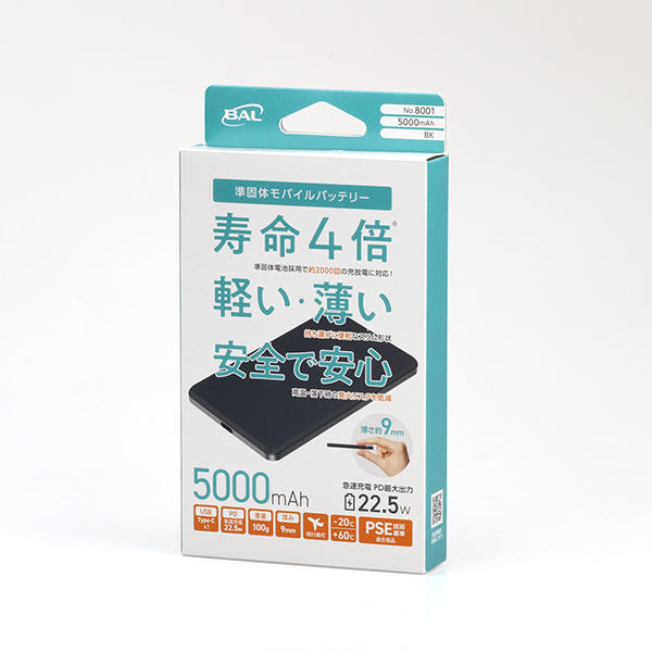 | 商品名 | No.8001 準固体モバイルバッテリー 5000mAh カラー:ブラック(安全性が高い準固体電池を採用/長寿命・軽い・薄い・安全で安心) |