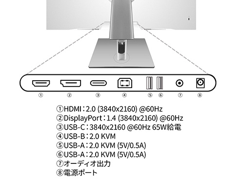 ■インターフェイスはHDMI2.0 x1 (60Hz)、DisplayPort1.4 x1 (60Hz)とUSB-C x1 (60Hz/最大65W給電)を装備し、様々な機器との接続が可能です。USB-C(最大65W給電)は、対応のPCであればUSB-Cケーブル1本でモニターへの映像出力とノートPCへの給電が可能。ケーブル1本でスッキリ接続出来るだけでなく、テレワーク、出社併用の場合などノートPCのACアダプターを持ち運ぶ必要が無くなります。