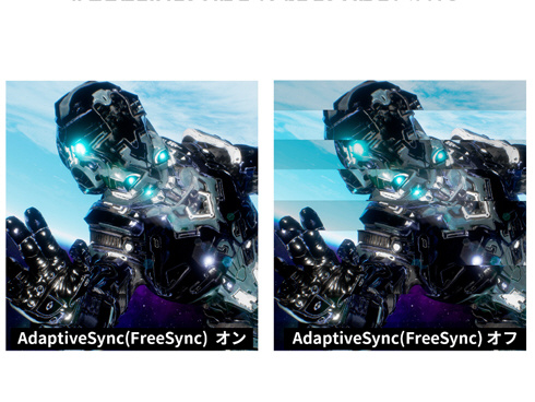 ■AdaptiveSync(FreeSync)に対応。画面のリフレッシュレートとコンテンツのフレームレートのズレから生じるティアリングを防ぎ、滑らかで美しい映像を実現します。