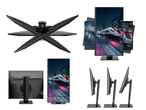 ■最大115mm(横置時)の範囲で高さ調整を行うことが可能な昇降式多機能スタンドを搭載。また、水平方向のスイーベル(左右各30度)、上下の角度調整チルト(-5度〜+20度)も可能です。