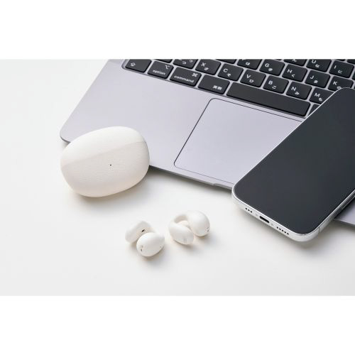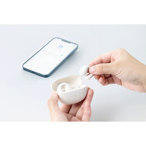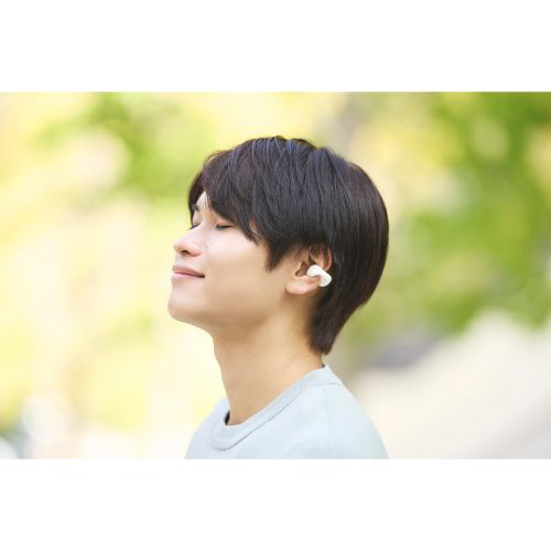 オープンイヤー型の完全ワイヤレスイヤホンです。耳への負担感が少ないイヤーカフ形状により、軽やかな着け心地で快適に装着できます。