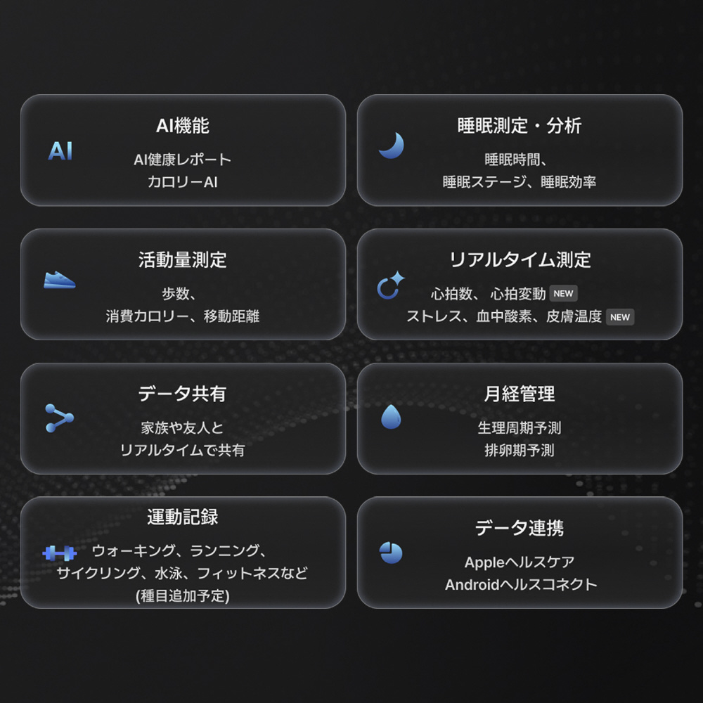 AI機能(AI健康レポート、カロリーAI)、睡眠測定・分析(睡眠時間、睡眠ステージ、睡眠効率)、活動量測定(歩数、消費カロリー、移動距離)、リアルタイム測定(心拍数、心拍変動、ストレス、血中酸素、皮膚温度)、データ共有(家族や友人とリアルタイムで共有)、月経管理(生理周期予測、排卵期予測)、運動記録(ウォーキング、ランニング、サイクリング、水泳、フィットネスなど)、データ連携(Appleヘルスケア、Androidヘルスコネクト)・データ処理は日本国内のサーバーにて行われるため安心・IP68+5ATM防水・スマホと安定的につながるBlutooth5.2使用・約90分の充電で最大7日間使用可能。