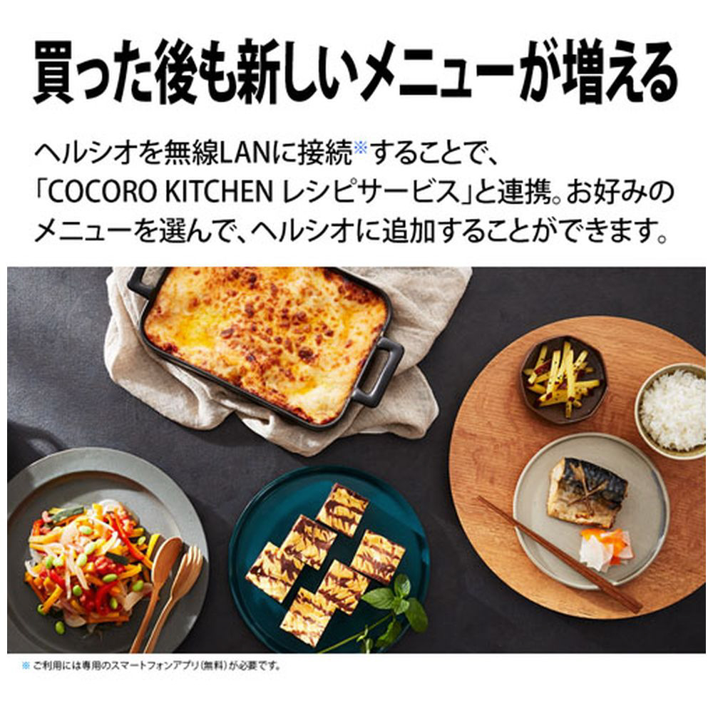 ヘルシオを無線LANに接続することで、「COCORO KITCHEN レシピサービス」と連携。外出先でもスマホからメニューの閲覧や料理検索ができたり新しいメニューをヘルシオに追加できます。
