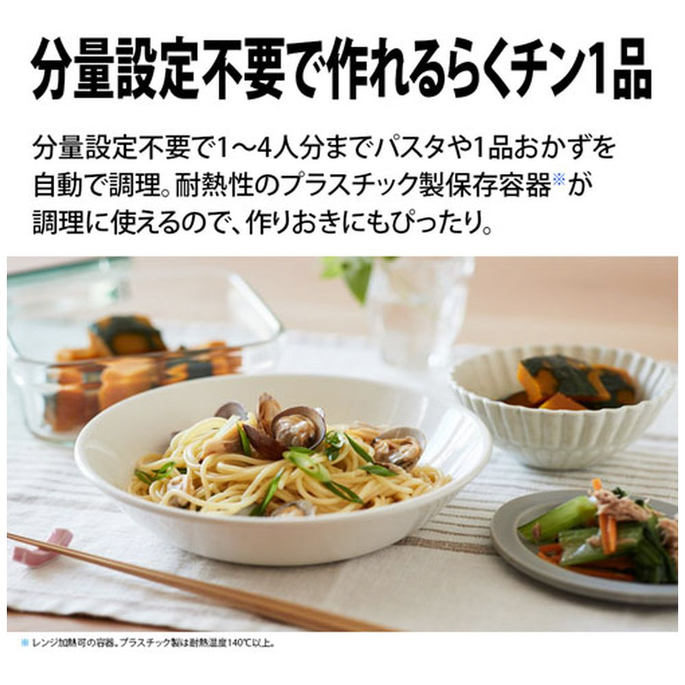 食品から発生する蒸気量で、食品の状態を検知する「らくチン!センサー」により、分量設定不要で1〜4人分までパスタや1品おかずを自動で調理。