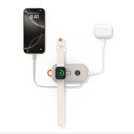 外出先でパワーバンクとして使用すれば、3台のデバイスを同時充電可。