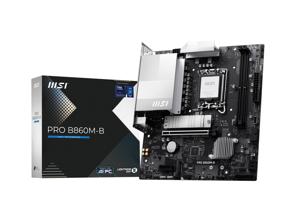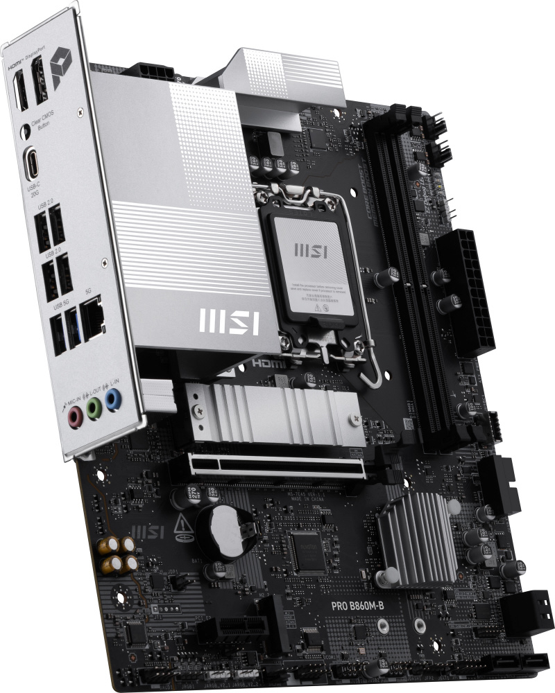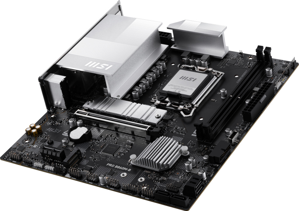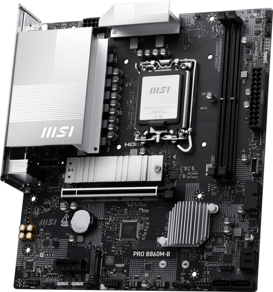 Intel B860チップセット搭載。ホワイトシルバーのヒートシンクを備えシンプルなデザインを採用したmicroATXマザーボード