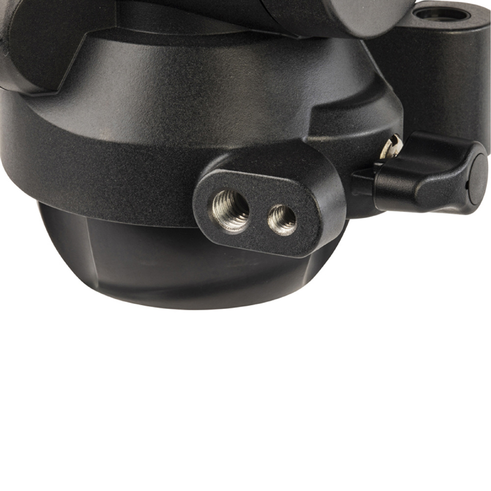 【特徴7】利便性を高めるアクセサリーポート : モニターやライトをアクセサリーアームなどで取り付けられるよう、ヘッド前面に1/4、3/8 インチのアクセサリーポートがあります。ベース部分に設けてあるのでヘッドの搭載重量や重心高、前後バランスに影響を与えません。