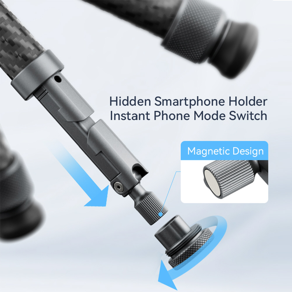 スマートフォンホルダーはセンターポールに内蔵で、幅65〜90mmに対応し、ほとんどのスマートフォンに適合。