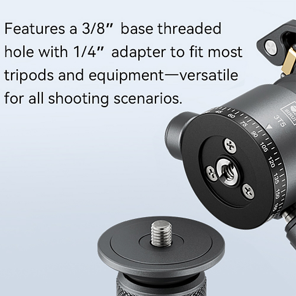 雲台のベース部に3/8インチネジ穴と1/4インチアダプターを備え、ほとんどの三脚や機器に対応。