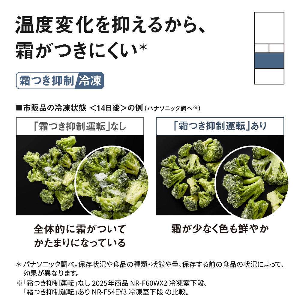 ●霜つき抑制 運転制御 非搭載 2025年商品 NR-F60WX2 冷凍室下段、霜つき抑制 運転制御 搭載 新製品 NR-F54EY3 冷凍室 下段(NR-E45RY3と同等性能)で保存の比較。