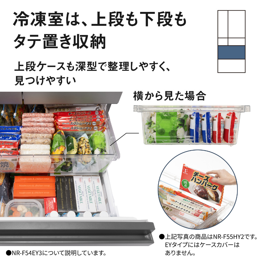 ※1 2024年商品 NR-F50EX1との比較。NR-F54EY3:幅650mm×奥行699mm、定格内容積542L、2024年商品NR-F50EX1:幅650mm×奥行699mm、定格内容積501L。