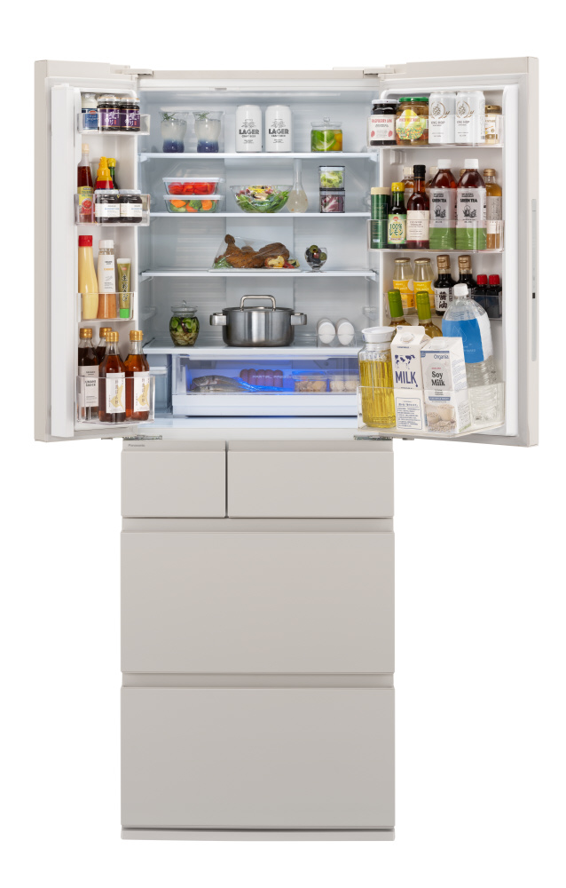 ・冷凍室が101L<69L>(※2)の大容量なのに、「奥まで見えるフルオープン」でケースまるごと引き出せるから、奥まで見えて、取り出しやすい。さらに、深型の上段ケース採用で食品をタテ置き収納できるから、見つけやすく・整理しやすい。