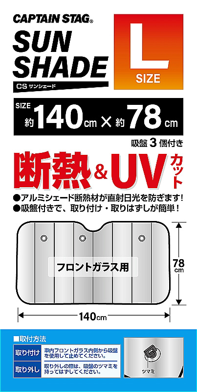 フロントガラス用サンシェード。断熱&UVカット。アルミシェード断熱材が直射日光を防ぎます。吸盤付きで、取り付け・取り外しが簡単。吸盤3個付き。