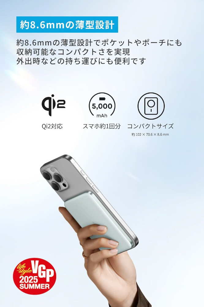 仕様2 Qi2対応でスマホ約1回分充電可能