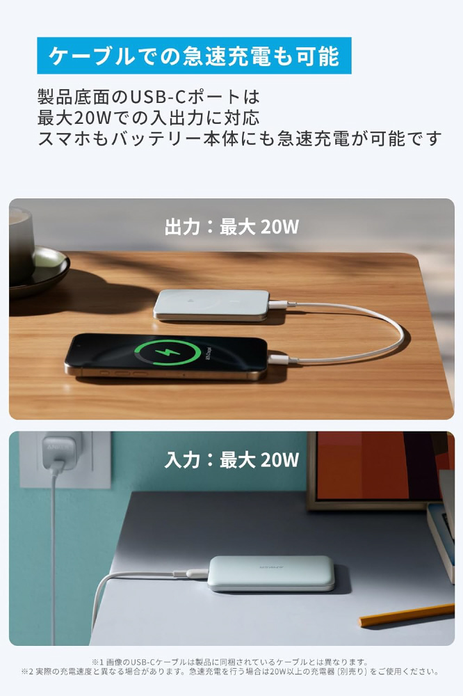 製品底面のUSB-Cポートは最大20Wでの入出力に対応。スマホもバッテリー本体にも急速充電が可能です。