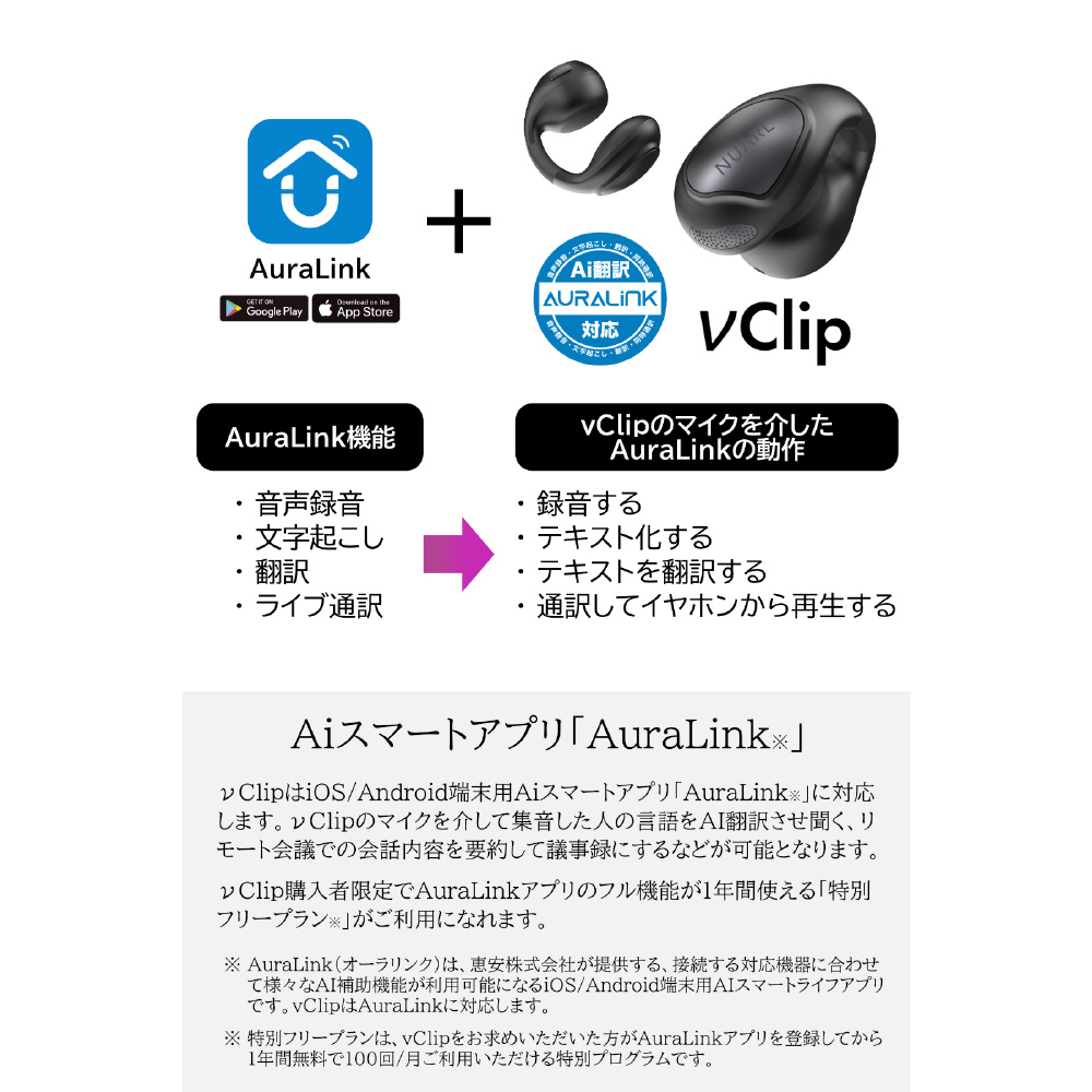 iOS/Androidの両方で使えるAIスマートアプリ「Auralink」に対応。νClipのマイクを使用して集音した人の言語をAIに翻訳させて聴いたり、リモート会議での会話内容を要約して議事録にすることもできます。νClip購入者限定でAuralinkのフル機能が1年間使える「特別フリープラン」が利用可能です。