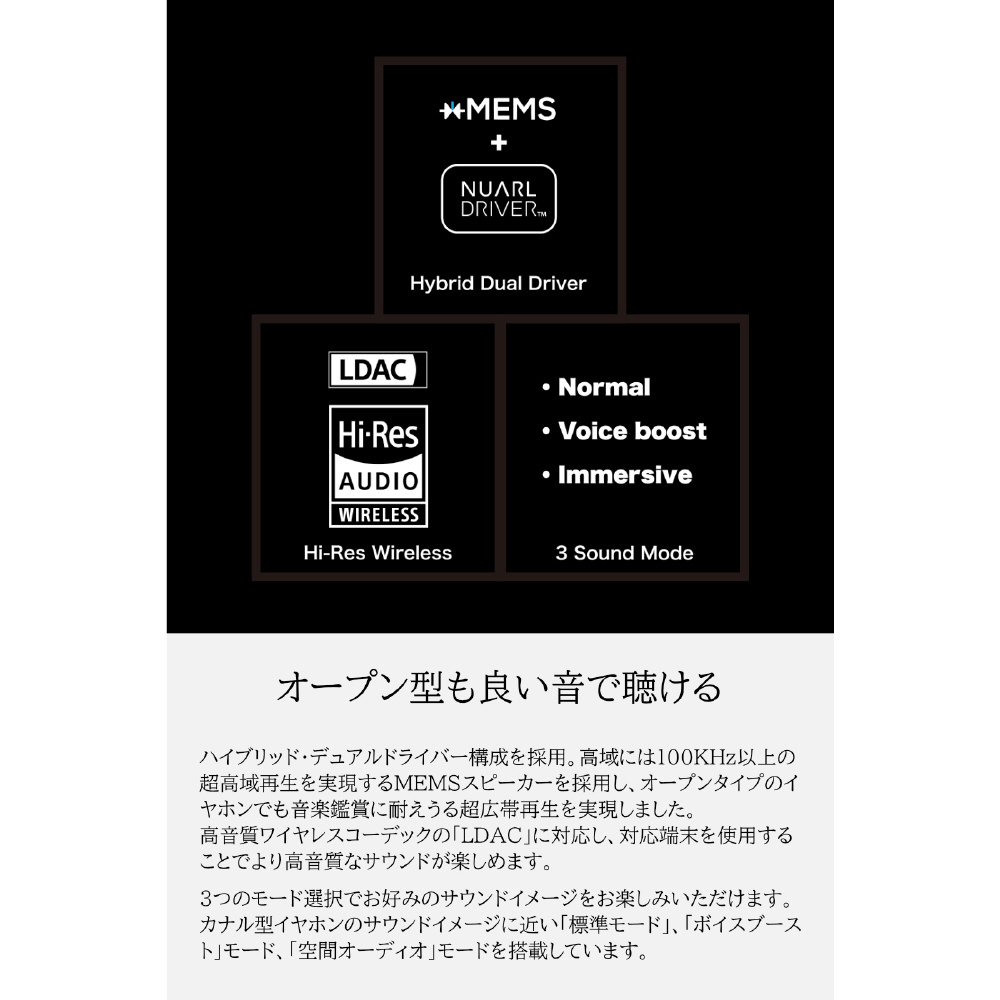 ハイブリッド・デュアルドライバー構成を採用。高域には100KHz以上の超高域再生を実現するMEMSスピーカーを採用し、オープンタイプのイヤホンでも音楽鑑賞に耐えうる超広帯再生を実現しました。