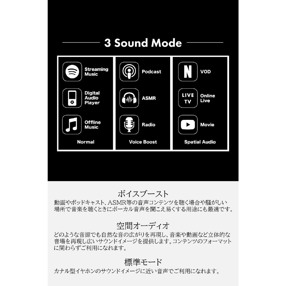 オープン型イヤホンでもカナル型イヤホンのサウンドイメージに近い標準モードの他に「ボイスブースト」モード、「空間オーディオ」モードを搭載。お好みのサウンドイメージを切り替えてお楽しみいただけます。
