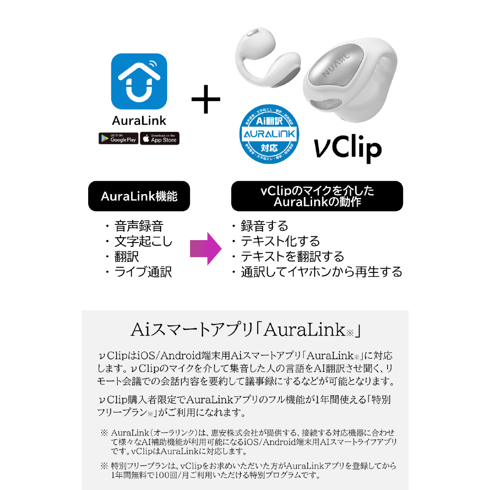 iOS/Androidの両方で使えるAIスマートアプリ「Auralink」に対応。νClipのマイクを使用して集音した人の言語をAIに翻訳させて聴いたり、リモート会議での会話内容を要約して議事録にすることもできます。νClip購入者限定でAuralinkのフル機能が1年間使える「特別フリープラン」が利用可能です。