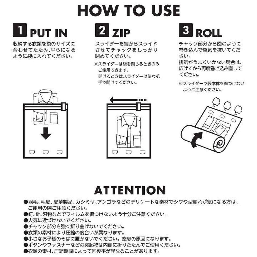 素材の織り込み方法にこだわり、縦にも横にも引っ張りに強い、丈夫な衣類圧縮袋です。中身が見えやすく、袋の表面には使用方法のイラストがデザインされています。Lサイズが1枚入っています。