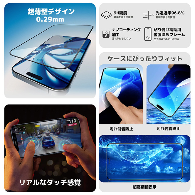 高透明度96.8%、超薄型0.29mmの旭硝子製強化ガラスフィルム。9H硬度で画面をしっかり保護し、滑らかな操作感を実現。