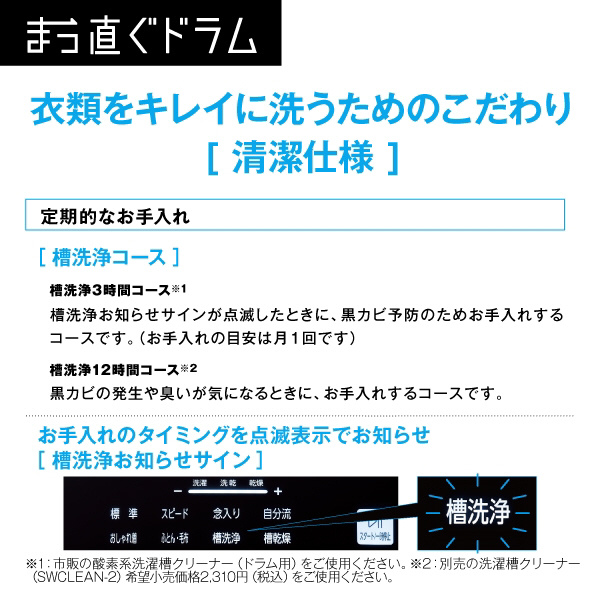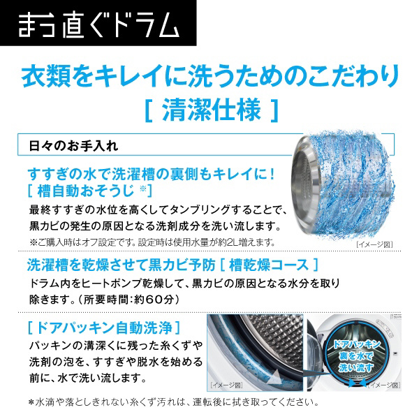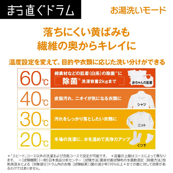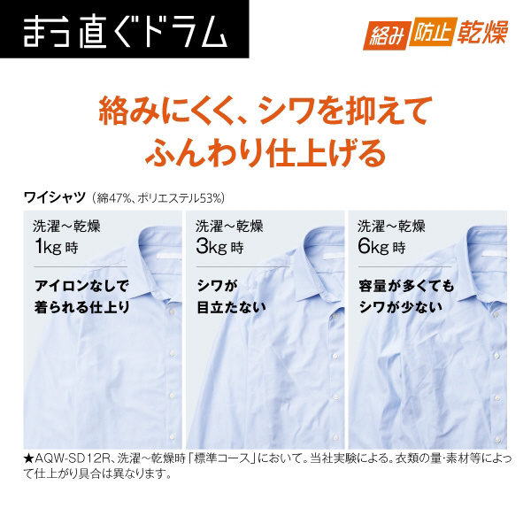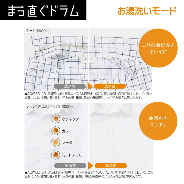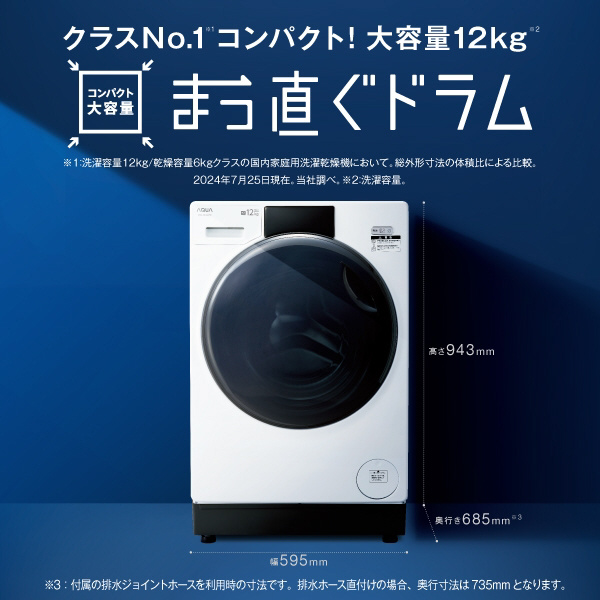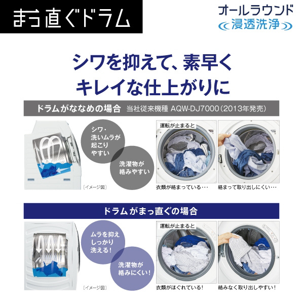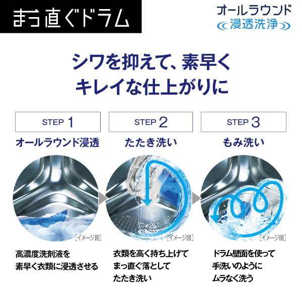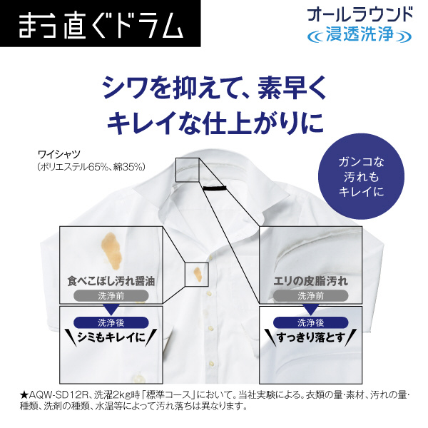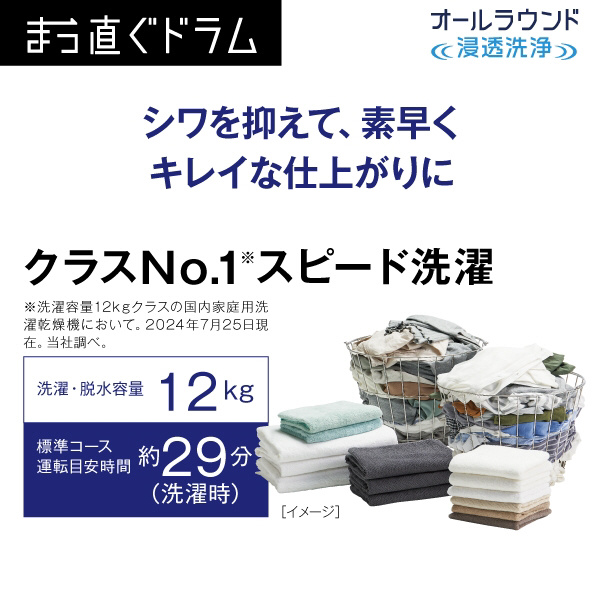 ドラム式洗濯乾燥機「まっ直ぐドラム」大容量12kgなのにコンパクト。お湯洗いモードで落ちにくい黄ばみも繊維の奥からキレイに。