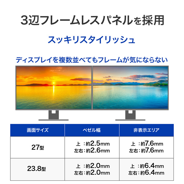極細フレームですっきりした印象を与え、マルチディスプレイにもオススメです。