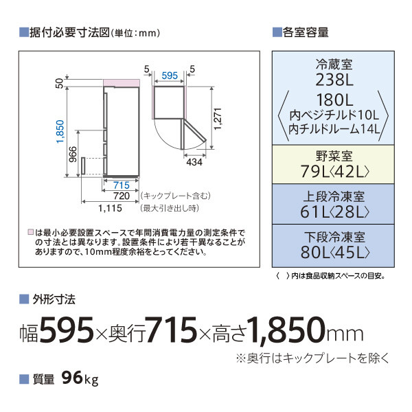 | 外形寸法(幅×高さ×奥行)mm(ハンドル・脚カバーを除く) | 595×1850×715mm |