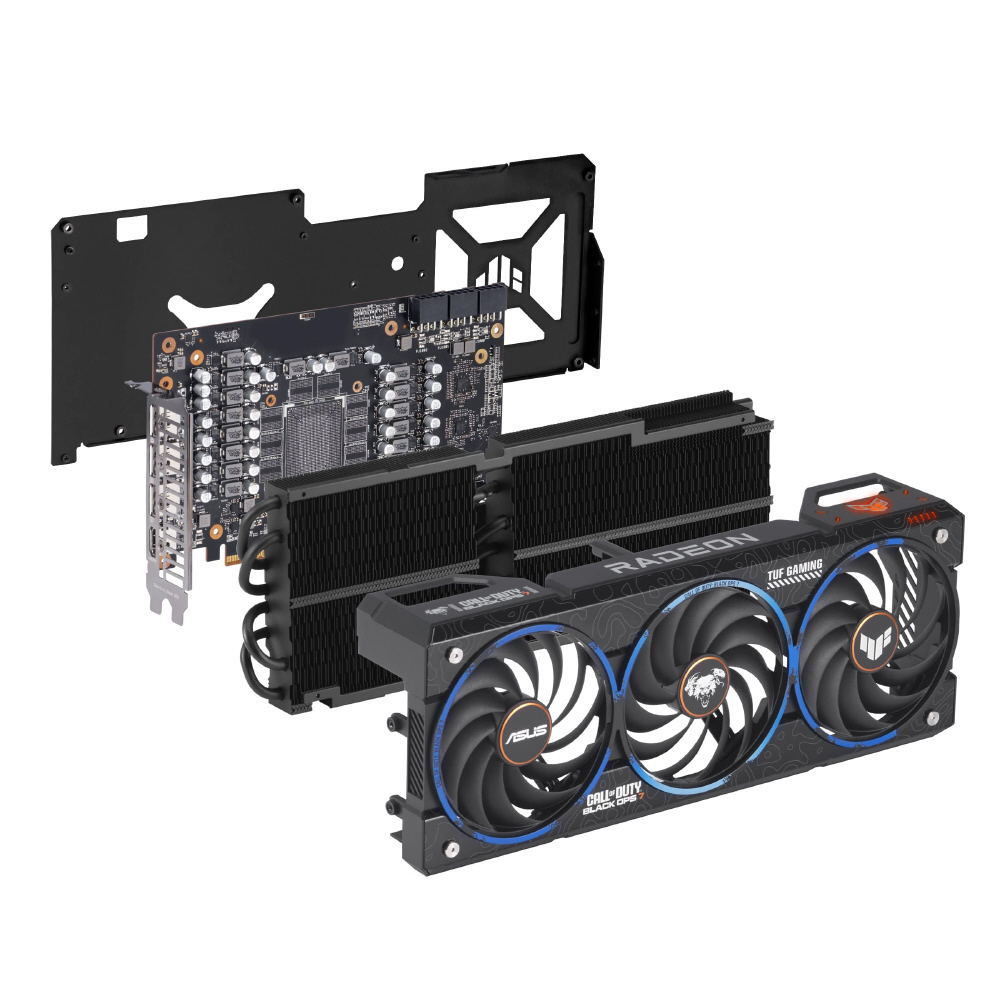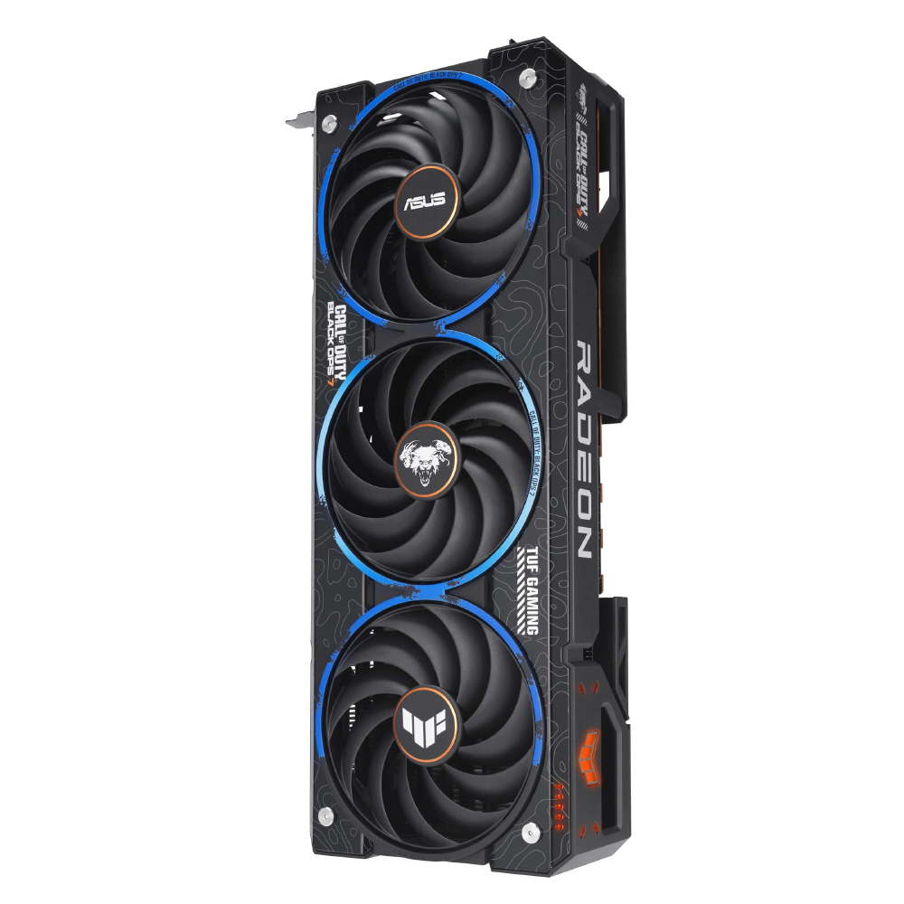 この限定版スペシャルエディションのグラフィックスカードは、ASUS、AMD、そしてCall of Duty: Black Ops 7のコラボレーションによるものです。カスタマイズされた筐体とバックプレートには、Black Ops 7のアイコンやBlack Opsスタイルを象徴するオレンジ色のアクセントなど、Black Ops 7の要素と図像があしらわれています。