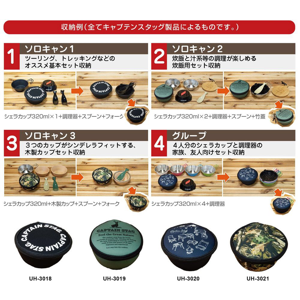 | 仕様3 | 外径120×高さ45mm、容量320mm程度のシェラカップ4個程度を収納できます。 ※形状などにより収納できない場合がございます。 |