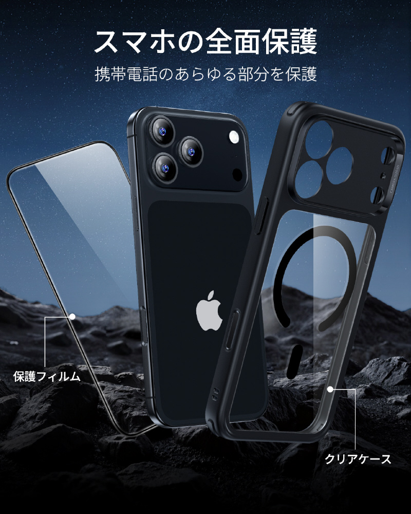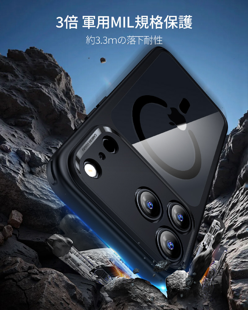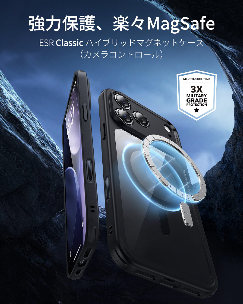 米軍規格MIL-STD-810Hの落下試験に合格したエアガードコーナー(認証番号:GZMR231203686802)を採用します。コンクリートへの高さ3.3メートル落下テストにも耐える設計で、駅のホームでの使用や登山中など、アクティブなシーンでも安心できます。うっかり落とした時も、大切なiPhoneを確実にプロテクトします