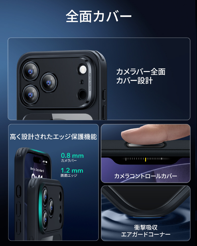 革新的なカメラコントロールボタンを専用カバーで守りながら、指先に伝わるプロ級の操作感をそのまま体感できます。スライド時の滑らかな動きから押圧時の確かな反発感まで、本体と遜色ない精密なタッチレスポンスを実現します。ボタン周辺の隙間を完全に封鎖する設計で、ほこり侵入を徹底シャットアウトします。精密センサーを埃のストレスから守り、シャッターチャンスを逃さない快適操作を長く支えます