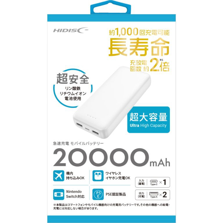 | 商品名 | リン酸鉄モバイルバッテリー 20000mAh ホワイト HD-MB20000RSLSWH [3ポート] |