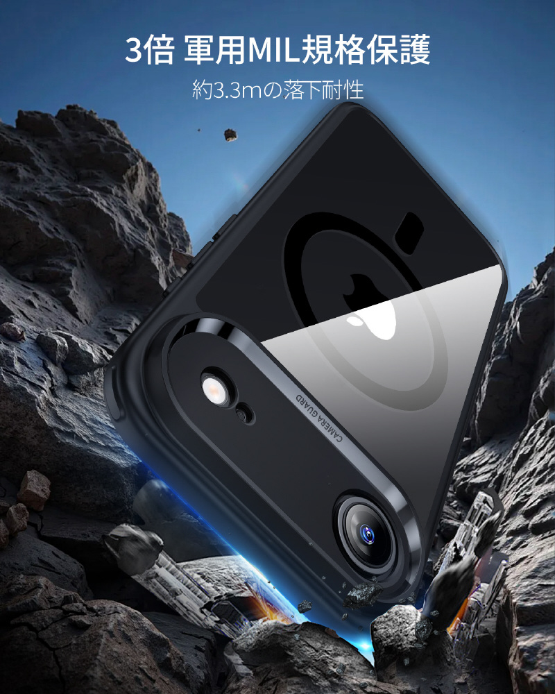 米軍規格MIL-STD-810Hの落下試験に合格したエアガードコーナー(認証番号:GZMR231203686802)を採用します。コンクリートへの高さ3.3メートル落下テストにも耐える設計で、駅のホームでの使用や登山中など、アクティブなシーンでも安心できます。うっかり落とした時も、大切なiPhoneを確実にプロテクトします