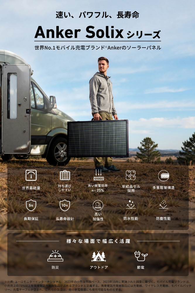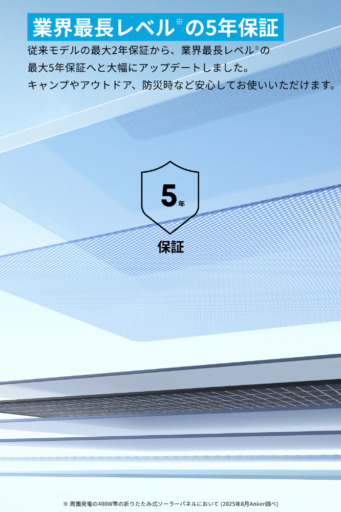 製品の保証期間が従来モデルの最大2年から、業界最長レベルの最大5年保証へと大幅にアップデート。キャンプやアウトドア、防災時など、より安心してAnker Solix PS400 Dual Portable Solar Panelをお使いいただけます。