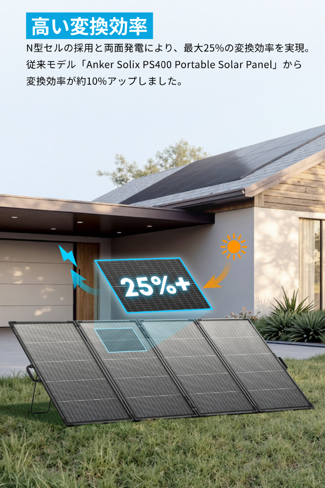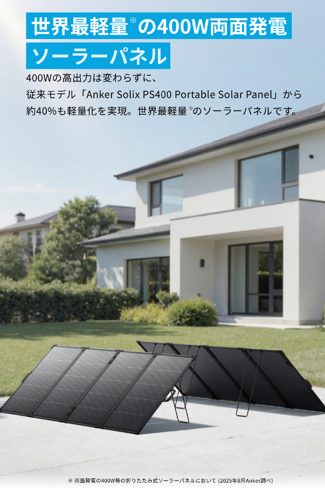※両面発電の400W帯の折りたたみ式ソーラーパネルにおいて(2025年8月Anker調べ)。
