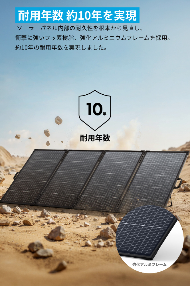 ソーラーパネル内部の耐久性を根本から見直し、多重階層構造や耐久性の高いETFE素材、衝撃に強いフッ素樹脂、強化アルミニウムフレームを採用し、約10年の耐用年数を実現しました。